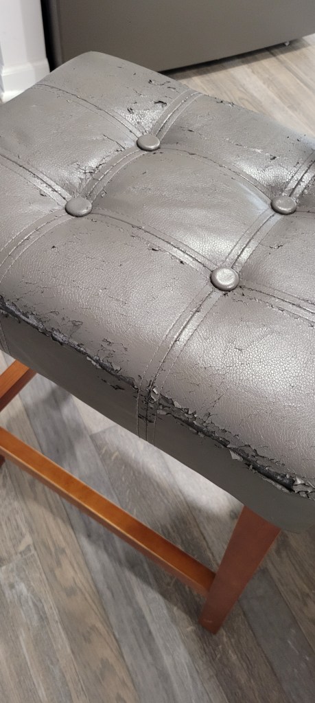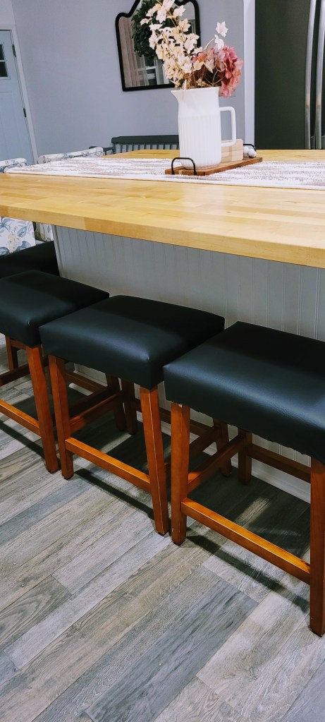 Are we upholsterers? No, but the seat covers of our island stools, purchased about four years ago, are crumbling. To make the case for frugality, it cost us $9 to recover the stools. They transformed from gray to blackāno fancy seams or buttonsājust five plain black stools. We shall see how they hold up.