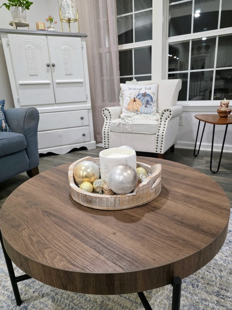 I found some “fall balls” to hang in my window. And then added them to my coffee table. It’s the little things!