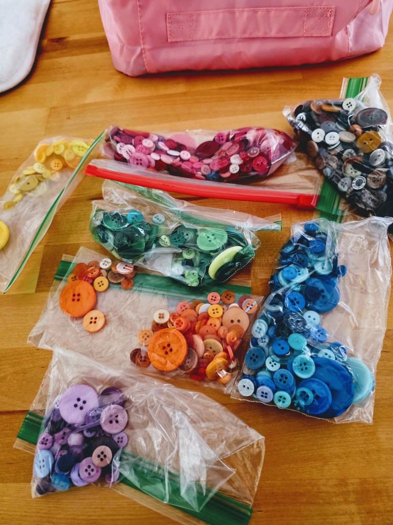 Working on a craft, I pulled out my Button Bag. A memory surfaced that I had totally forgotten. When mom was bedridden with cancer, we tried finding little jobs to help her feel productive. Enter Amazon and 600 colorful buttons. Mom gladly sorted my buttons for hours.